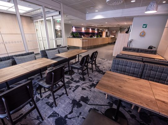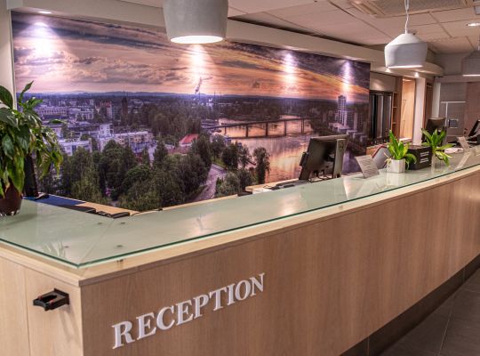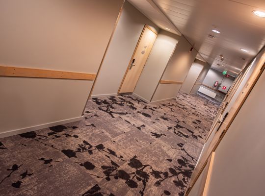 Huoneiden ja käytävien maalaustyöt sekä käytävien mattotyöt. Aulabaarin irtokalusteet ja valaisimet sekä respan taustan valokuvatapetti.